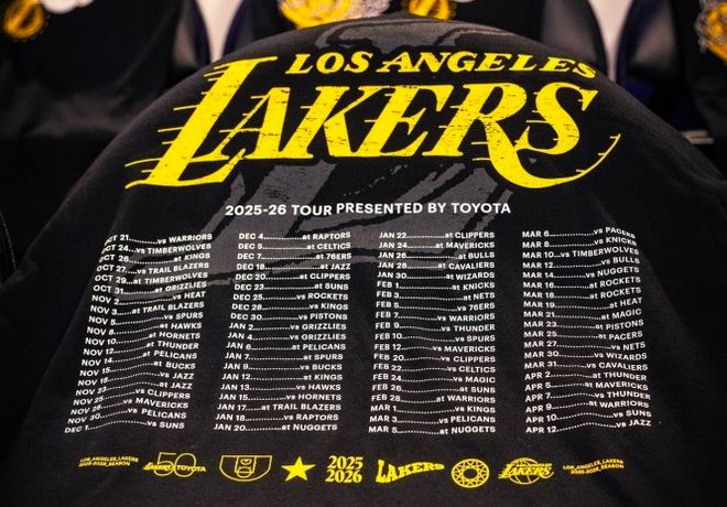 湖人主场揭幕战送定制T恤,背部印有新赛季完整赛程